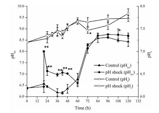 胞內pH對于微生物的生長和代謝至關重要,它可以影響營養(yǎng)物質的吸收和利用、蛋白質合成、線粒體呼吸、碳水化合物代謝和其他重要的生命活動(Cotter et al.,2001)。因此,只有維持胞內pH的穩(wěn)定,才能保證微生物的正常生長和代謝。如圖3所示,在整個發(fā)酵過程中,胞內pH略有上升,從開始的7.21到最后7.73。Corvini等人(Corvini et al.,2004)也使用BCECF-AM熒光探針測定普拉特鏈霉菌(Streptomyces pristinaespiralis)的胞內pH,其范圍在6.5至8.5之間。還發(fā)現基因SHJG7463編碼