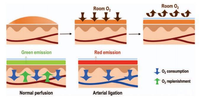 圖1氧傳感涂敷繃帶。(上左)將氧傳感涂料繃帶涂成液體。(上中)繃帶凝固成透氣薄膜。(上右)貼上阻隔性Tegaderm薄膜,減緩與室內空氣的氧氣交換。(下左)當組織血流灌注良好時,繃帶會發出綠色光;(下中)當組織缺氧時,繃帶會發出紅色光。