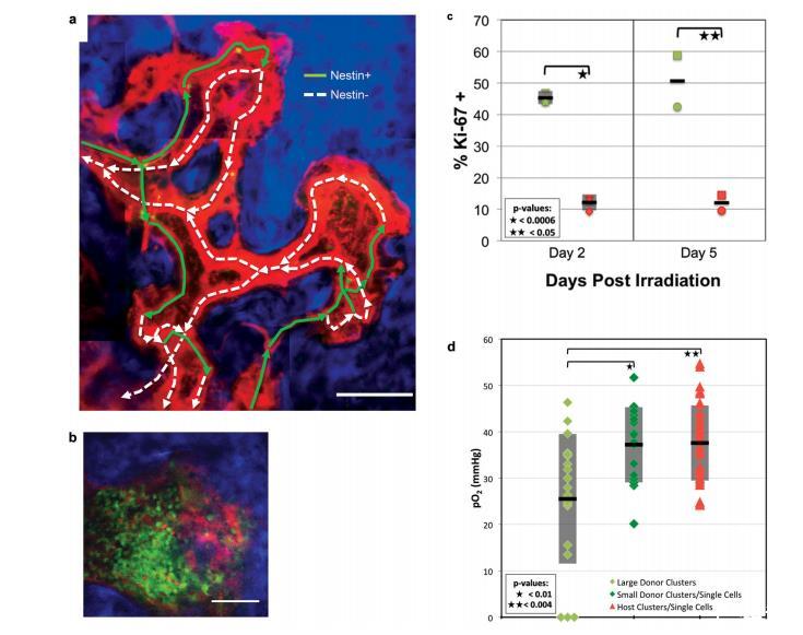 (a)nestin-GFP小鼠的血管連接圖顯示,nestin+血管位于竇道的上游并向竇道排水。表示血流方向的箭頭是通過視頻速率成像跟蹤標記的RBC的移動確定的,并疊加在BM血管的最大強度投影圖上(紅色=血管染料,綠色=nestinGFP/RBC,藍色=SHG骨信號)。綠色實線表示血管與鄰近的nestin+細胞,白色虛線表示nestin-血管。縮放條~100μm。(b)一個通用DsRed受體的骨髓在移植了來自通用GFP供體的2,500萬個骨髓細胞5天后的體內圖像。紅色=DsRed,綠色=GFP,藍色=骨的SHG。縮放條~100μm。(c)移植后第2天(n=3只小鼠)和第5天(n=2只小鼠),通過FACS對綠色(供體)和紅色(宿主)骨髓細胞進行Ki-67染色。每個符號代表不同的小鼠。刻度線(第2天)為平均值的±標準偏差。(d)與小的供體細胞群/單細胞(4只小鼠,n=16個位置)和宿主細胞群/單細胞(5只小鼠,n=40個位置)相比,大的供體細胞群(4只小鼠,n=19個位置)區域的體內pO2值。圖中顯示了每組數據的平均值(黑線)和±標準偏差(陰影框)。