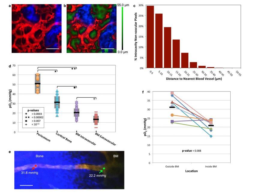 (a)小鼠腓腸肌的可見光內最大強度圖像(約75μm厚),顯示血管(紅色,Qtracker655血管染料)和骨(藍色,膠原SHG)。(b)三維虛擬成像堆棧的相應單個平面,顯示血管(紅色)、骨SHG(藍色)以及BM中每個血管外像素到最近血管壁的三維歐氏距離測量值(EDM,綠色)。(c)全三維成像堆棧中所有EDM的直方圖。(d)與骨膜和皮質骨血管中的pO2相比,骨髓中的pO2明顯較低。每個點代表一個單獨血管或間隙位置的pO2測量值(8只小鼠的骨膜、皮質骨、BM血管內和BM血管外的血管/位置分別為8、21、55和40個)。圖中顯示了每組數據的平均值(黑線)和±標準偏差(陰影框)。(e)血管從骨骼進入BM的最大強度投影圖像。骨骼(藍色)和血管(黃色)分別用SHG和RhodamineB-dextran/PtPC343熒光勾勒。兩個箭頭分別指向血管進入BM前后測量pO2的位置。(f)追蹤進入BM的單個血管時pO2的下降(n=4只小鼠的8根血管)。顯示的是每組數據的平均值(黑線)。刻度線~100μm。