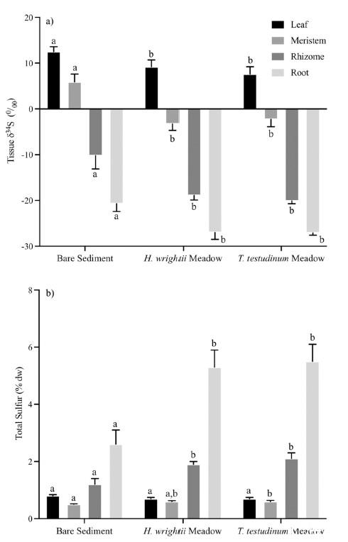 圖1、(a)三種生境(裸沙單株、H.wrightii草甸、T.testudinum草甸)中海龜草葉片、頂端分生組織、根狀莖及根的穩定硫同位素值(δ3?S)。不同字母表示生境間差異顯著(季節平均值±標準誤)。(b)各部位總硫含量(TS,干重百分比)。