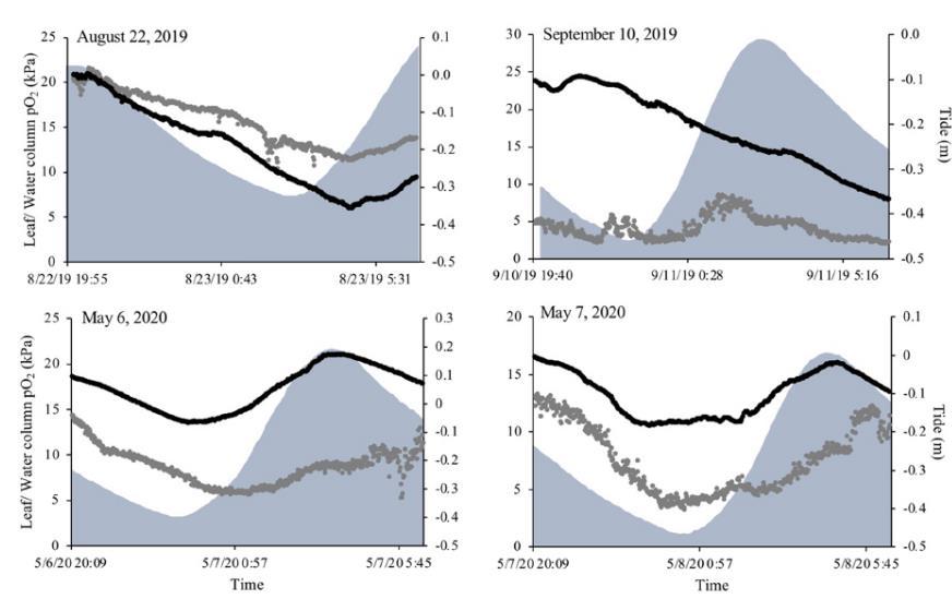 圖5、夜間葉片與水柱pO?受潮汐影響。夜間(日落至日出)葉片(灰線)與水柱(黑線)pO?以及潮位(陰影灰)漲潮時水柱O?升高,葉片內O?同步增加5–8 kPa,形成潮補氧效應。