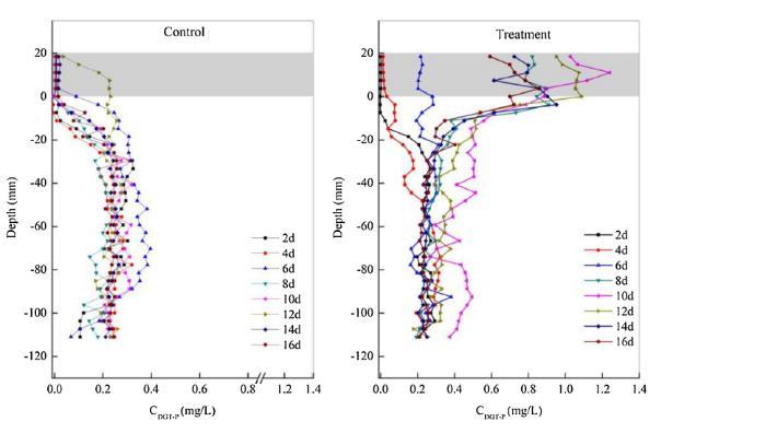 圖3、DGT技術測量的沉積物-上覆水剖面中可溶性磷的變化。ZrO-Chelex DGT測量結果顯示,處理組(右)可溶性P在SWI附近形成明顯濃度峰,最高值出現在第10天(0.87±0.26 mg/L),且濃度梯度指向沉積物和上覆水兩個方向。對照組(左)P濃度隨深度增加而緩慢升高,表明其釋放主要來自沉積物鐵氧化物的還原溶解?;疑幱皡^標示上覆水區域(SWI上方20mm)。