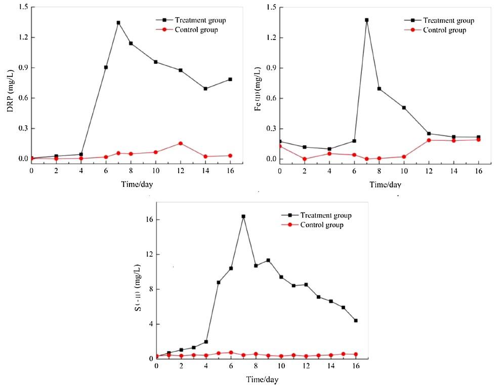 圖1、水柱中SRP、可溶性Fe(II)和S(-II)在培養期間的變化。本圖展示了添加藻類處理組和對照組在水柱中可溶性活性磷(SRP)、亞鐵離子(Fe(II))和硫化物(S(-II))濃度隨時間的變化規律。處理組三種物質均呈現先升高后降低的單峰變化趨勢,第7天達到峰值(SRP 1.36 mg/L,Fe(II)0.69 mg/L,S(-II)16.37 mg/L)。對照組則保持相對穩定的低濃度水平。這種差異直觀反映了藻類分解對水化學環境的顯著影響。