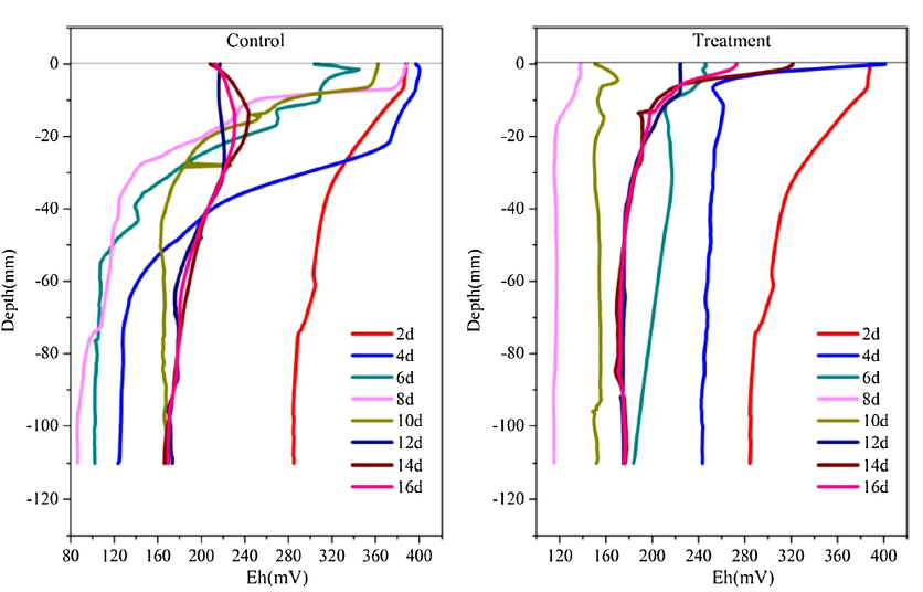圖2、培養期間沉積物剖面Eh值的變化。通過Unisense微電極系統測量的沉積物氧化還原電位(Eh)剖面顯示,處理組(右)在前8天Eh值持續下降,最低點出現在約-20mm深度處,表明藻類分解創造了強還原環境。對照組(左)Eh值變化相對平緩,后期上層沉積物出現Eh值下降,反映有機質的自然礦化過程。兩組差異證實藻類添加顯著加速了沉積物的還原進程。