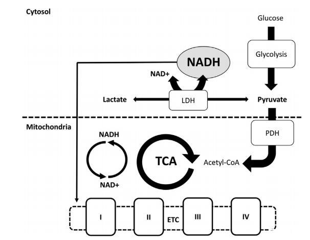 本研究的主要發(fā)現(xiàn)是,在高血糖條件下,NRK-52E細胞經(jīng)草氨酸處理后,新陳代謝完全改道。這似乎導致了基礎和最大呼吸能力的提高以及乳酸生成的減少。乳酸鹽的產(chǎn)生與氧化還原平衡密切相關,即與細胞膜NAD+/NADH平衡密切相關。有趣的是,乳酸鹽生成量的主要變化受高血糖條件的影響,而氧化還原平衡(NAD+/NADH比率)、細胞活力和增殖則受草酸鹽處理的影響。這表明乳酸脫氫酶LDH抑制確實會導致NAD+/NADH比率發(fā)生巨大變化,進而引導NRK-52E細胞增加氧化磷酸化(圖5)。這些發(fā)現(xiàn)與高度糖酵解細胞的報告一致,在高度糖酵解細胞中,草氨酸已被證明能將糖酵解通量轉(zhuǎn)向氧化磷酸化,即把沃伯格代謝表型(即使在有足夠氧氣維持氧化磷酸化的情況下,乳酸鹽的產(chǎn)生也會增加)轉(zhuǎn)變?yōu)榘退沟麓x表型。