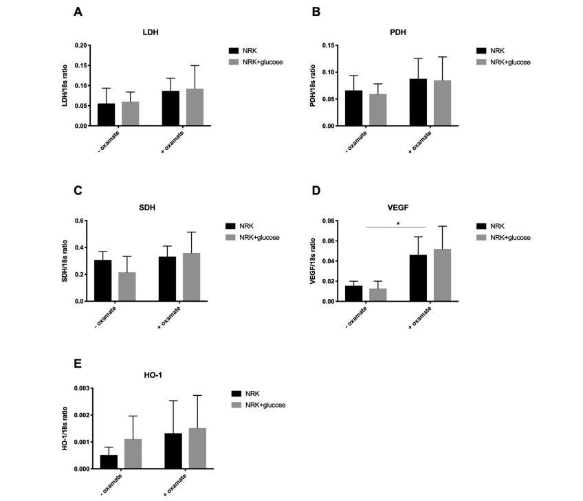 為了了解代謝和呼吸的變化是如何發(fā)生的,我們檢測了關鍵酶的mRNA表達水平,發(fā)現(xiàn)LDH、丙酮酸脫氫酶(PDH)和琥珀酸脫氫酶(SDH)的表達幾乎不受高血糖培養(yǎng)條件的影響。另一方面,草氨酸處理會增加正常和高血糖NRK-52E細胞培養(yǎng)物中所有基因的表達,但并不顯著(圖4A-C)。在正常和高血糖的NRK-52E細胞中,草酸鹽處理和未處理的NRK-52E細胞中血管內(nèi)皮生長因子的表達均有明顯變化(p=0.0004)(圖4D),血紅素氧合酶-1(HO-1)標記物的表達也有同樣的趨勢(圖4E)。