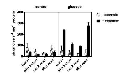 圖3:經(jīng)100mM草氨酸處理或未經(jīng)100mM草氨酸處理的對照細胞和高血糖細胞培養(yǎng)物的呼吸參數(shù)。對基礎呼吸、ATP鏈接呼吸、泄漏呼吸和最大呼吸進行了測定。單用高血糖條件和草氨酸處理對所有測量參數(shù)的影響都是遞減的,而在高血糖條件下用草氨酸處理細胞可顯著增加所有呼吸參數(shù)(p<0.0001)。