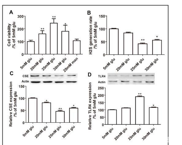 圖1. 高葡萄糖(HG)誘導小鼠系膜細胞顯著過度增殖,這可能部分歸因于內源性H?S合成缺陷或TLR4激活。(A)HG誘導小鼠系膜細胞顯著過度增殖。25 mM甘露醇處理未顯著改變小鼠系膜細胞活力(數值為均值±標準誤;P < 0.05,P < 0.01 vs. 5mM葡萄糖;##P < 0.01 vs. 25 mM葡萄糖;n = 4)。(B)與5 mM葡萄糖相比,25 mM和30 mM HG處理顯著降低H?S生成速率(數值為均值±標準誤;P < 0.05,P < 0.01 vs. 5 mM葡萄糖;n = 4)。(C)HG處理以濃度非依賴性方式顯著降低CSE表達(數值為均值±標準誤;P < 0.05,P < 0.01 vs. 5 mM葡萄糖;n = 4)。(D)25mM和30mM HG處理顯著增加TLR4表達(數值為均值±標準誤;P < 0.05,**P < 0.01 vs. 5 mM葡萄糖;n = 4)。