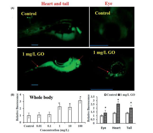 圖6、胚胎中氧化石墨烯誘導的ROS。(A)96hpf時胚胎特定區域ROS生成的代表性圖像。箭頭表示胚胎中產生過量ROS的器官。所有圖像的比例尺均為20毫米。(B)96hpf時胚胎全身和特定區域ROS的半定量分析。相對熒光強度通過減去胚胎的自身熒光進行調整。