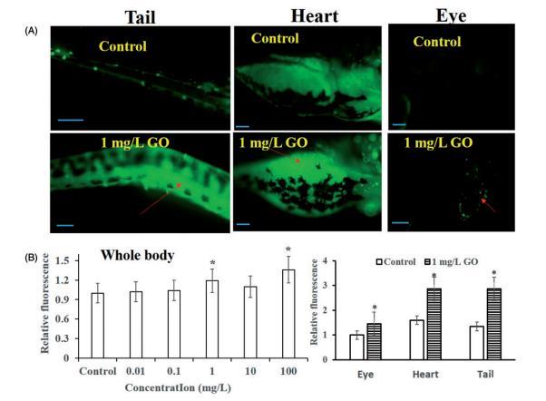 圖5、氧化石墨烯對96hpf后胚胎凋亡的影響。(A)胚胎特定區域凋亡的代表性圖像。箭頭表示胚胎的主要凋亡區域。(B)96hpf胚胎全身和特定區域凋亡的半定量分析。相對熒光強度通過減去胚胎的自身熒光進行調整。所有圖像中的比例尺均為20毫米。