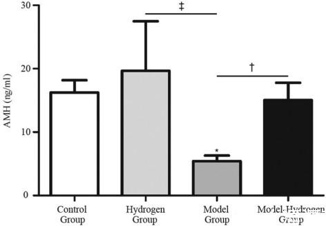 圖1、富氫水對血清抗苗勒管激素(AMH)濃度的影響。數據以均值±標準誤表示。與對照組相比*P<0.05;?P<0.05;?P<0.01。