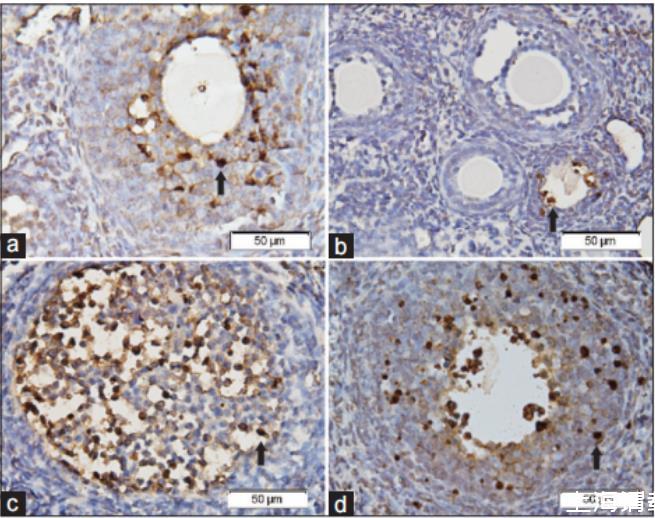 圖3、卵巢凋亡顆粒細胞的形態學分析。(a)對照組、(b)富氫水組、(c)模型組和(d)模型-富氫水組中的TUNEL陽性顆粒細胞。深棕色點(黑色箭頭)指示凋亡顆粒細胞。比例尺=50μm。TUNEL:末端脫氧核苷酸轉移酶dUTP缺口末端標記。