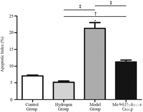 圖2、富氫水對顆粒細胞凋亡指數的影響。通過TUNEL法評估凋亡。數據代表均值±標準誤。與對照組相比*P<0.001;?P<0.05;?P<0.001。TUNEL:末端脫氧核苷酸轉移酶dUTP缺口末端標記。