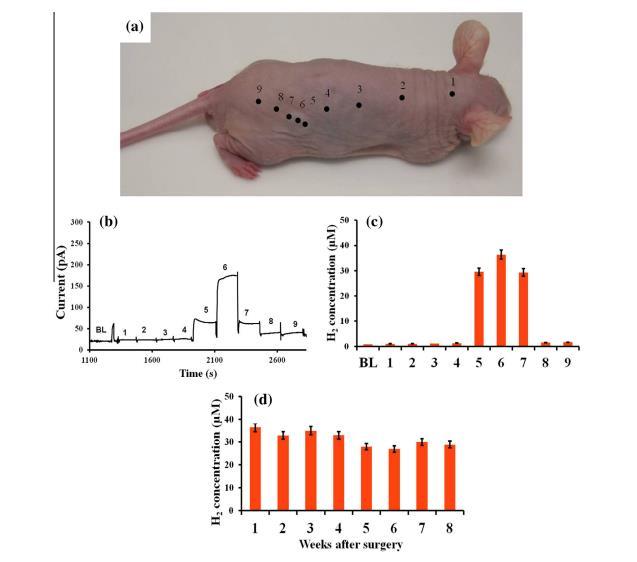 圖3、AZ31植入皮下1周后,對麻醉裸鼠進行H2測量。(a)標(biāo)有測量點并編號的小鼠照片。(b)與(a)中編號點相對應(yīng)的瞬間電流反應(yīng)。(c)根據(jù)校準(zhǔn)曲線測定的各點H2濃度。BL是在空氣中的測量值。(d)AZ31(N=3)在為期8周的研究期間每周監(jiān)測的H2濃度。每只小鼠以植入物正上方為中心進行一次測量。