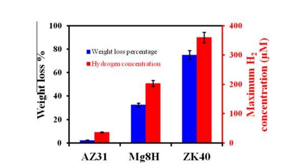 圖4、三種合金在植入2個月后重量減輕百分比與植入第一周后氫電極在體內(nèi)測得的最大H2濃度的相關(guān)性。誤差為三只小鼠(N=3)測量值的標(biāo)準(zhǔn)偏差。