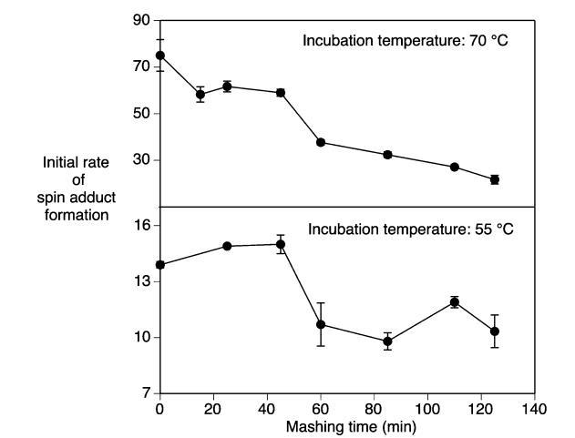 添加鐵的醪液和麥汁的ESR強(qiáng)制老化測(cè)試:從新鮮制備的FeSO4(Merck,Darmstadt,Germany)水溶液儲(chǔ)備液中,將最終濃度為50μM的FeSO4添加:(i)在糖化開(kāi)始時(shí),即麥芽與水混合時(shí),添加到醪液中;或(ii)添加到糖化和過(guò)濾后獲得的麥汁中。對(duì)糖化25分鐘和125分鐘后收集的麥汁樣品進(jìn)行ESR強(qiáng)制老化測(cè)試。