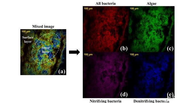 圖6 PBR-1中ABA的FISH圖像:組合圖像(a)、大部分細(xì)菌(b)、藻類(c)、反硝化細(xì)菌(d)和硝化細(xì)菌(e)。