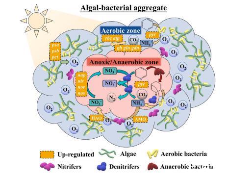 這項(xiàng)研究為同時(shí)去除含氮有機(jī)化合物和氮的藻類-細(xì)菌聚集體(ABA)系統(tǒng)提供了新的線索。ABA系統(tǒng)是通過(guò)將預(yù)培養(yǎng)的藻菌菌群接種到活性污泥中構(gòu)建的。硝化-反硝化作為共代謝過(guò)程,增強(qiáng)了吡啶和氮的同時(shí)去除。ABA中需氧和缺氧/厭氧生物過(guò)程的共存在微生物代謝和轉(zhuǎn)錄水平上得到了證實(shí)。ABA系統(tǒng)主要排放藻類-細(xì)菌生物量、O2和N2,導(dǎo)致溫室氣體排放近乎零,能耗極低,顯示出協(xié)同廢水回收和碳中和的多重功能的巨大潛力。