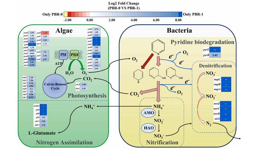圖7顯示了ABA系統(tǒng)中的微生物代謝機(jī)制和基因表達(dá)。通過(guò)將預(yù)培養(yǎng)的藻類-細(xì)菌共生體引入活性污泥,同化、硝化和反硝化可以共存為無(wú)需添加額外碳源的氮轉(zhuǎn)移途徑。首先,通過(guò)利用O2和NO3-作為電子受體,將吡啶-N通過(guò)吡啶生物降解轉(zhuǎn)化為NH4+-N。與PBR-0相比,pyrB和pyrE編碼的吡啶降解在PBR-1中上調(diào)并且僅在PBR-1中表達(dá),表明了更高效和多樣化的吡啶生物降解。然后,NH4+-N可以通過(guò)硝化轉(zhuǎn)化為NO2--N和NO3--N,而NO2--N和NO3--N通過(guò)異養(yǎng)反硝化作用轉(zhuǎn)化為N2。如圖S10所示。參與硝化-反硝化的關(guān)鍵酶,包括AMO、HAO、NAR、NIR、NOR和N2OR只存在于PBR-1中。參與反硝化酶的基因,包括napA、napB、napC、nirS、norB、norC和nosZ,僅在PBR-1中表達(dá)。相反,在PBR-0中它們沒(méi)有表達(dá)。因此,硝化-反硝化在PBR-1的ABA系統(tǒng)中對(duì)吡啶和氮的去除起到了關(guān)鍵作用。