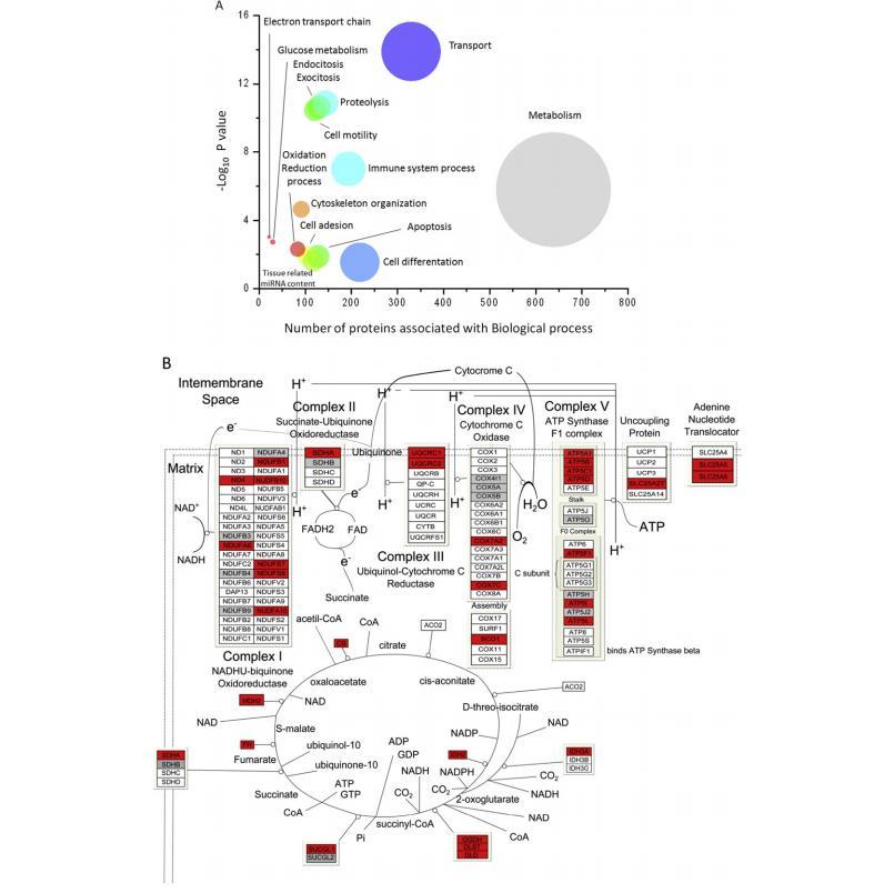 在外泌體中發現的蛋白質具有特定的多樣性,這可能意味著這些蛋白質具有不同的功能。為了評估這一點,我們使用細胞圖譜軟件進行了基于生物過程注釋的基因本體分析。外泌體的生物過程中至少有20%的相關基因,且經FDR校正后P≤0.05的值被認為是顯著的。基因本體分析確定了384個重要的頂級基因特征(數據未顯示)。圖5顯示了生物過程基因本體注釋分析的二維氣泡圖,突出顯示了尿液外泌體中存在的主要生物過程。這些過程包括:運輸、免疫系統過程、細胞分化、細胞運動、細胞粘附、細胞骨架組織、囊泡運輸、細胞凋亡調控、蛋白水解、組織相關miRNA含量和新陳代謝。事實上,有趣的是,大多數基因名稱特征與氧化代謝有關,其中葡萄糖代謝顯著豐富,從而包括TCA循環和呼吸電子鏈(圖5A)。特別是,TCA循環酶(ACO2是唯一的例外)和103個呼吸鏈蛋白中有34個被鑒定出來。盡管如此,如圖5B所示,這34個蛋白質代表了所有五種呼吸鏈復合物。