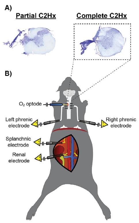 圖1、A)用甲酚紫染色的代表性40μm切片,以評估部分或完全頸脊髓半切開術(C2Hx)后兩周的病變嚴重程度。B)顯示終末神經生理動物準備的示意圖,同時記錄了完整的C2Hx大鼠的膈肌運動池附近/內的脊髓組織氧合,雙側膈神經活動,內臟和腎交感神經活動。