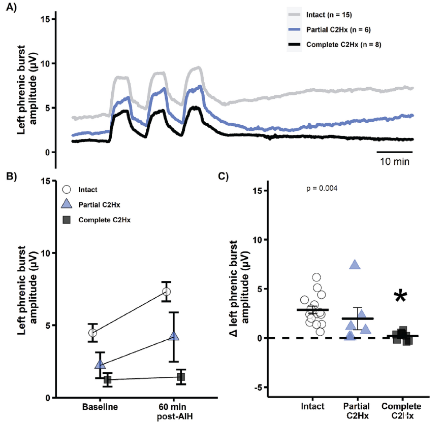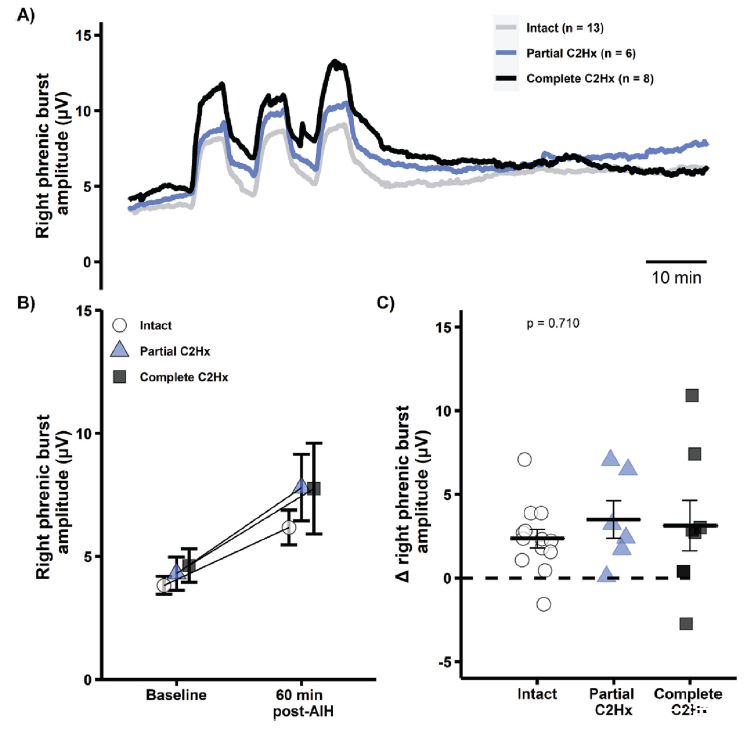 圖5、膈肌長期促進作用(LTF)在脊髓C2半切(部分和完全C2Hx)兩周后損傷側得以保留。A)在完整(灰色線)、部分C2Hx(藍色線)和完全C2Hx大鼠的中度急性間歇性缺氧(AIH)實驗中,平均右側膈肌爆發峰值振幅曲線。B)實驗組在基線和60分鐘后中度急性間歇性缺氧(mAIH)期間右側膈肌爆發峰值振幅的平均積分值±平均標準誤差。C)膈肌收縮波的總體變化量從基線到60分鐘的峰值振幅MAIH后。