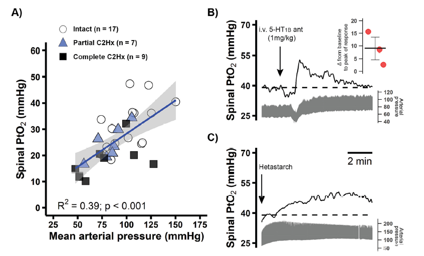 圖3、基線時的脊髓組織氧壓(PtO)與脊柱C2半切術(C2Hx)后動脈壓水平之間的關聯。A)考慮所有實驗組的數據,平均動脈壓和脊髓PtOat基線之間的線性回歸。B)用5-HT1B受體拮抗劑(注射時間用箭頭表示)靜脈內(靜脈注射;1mg/kg)治療的完整C2Hx大鼠的代表性脊髓氧分壓(上)和搏動動脈壓痕跡(下)。C)注射5mL異淀粉靜脈注射以提高動脈壓的完整C2Hx大鼠的脊髓氧分壓(頂部)和搏動動脈壓痕跡(底部)。