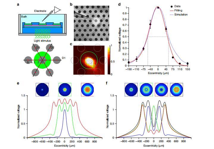 然后,我們采用實(shí)驗(yàn)/計(jì)算混合方法來解決空間選擇性問題。首先,我們使用玻璃微電極(圖7a、b)測量了單個(gè)像素被照亮?xí)r三個(gè)方向(D1、D2和D3)的徑向電壓擴(kuò)散(圖7c)。對于每個(gè)被照亮的像素,三個(gè)主要方向上的歸一化電壓擴(kuò)散都已取平均值。所有測試像素的平均電壓分布已繪制并用高斯函數(shù)插值(圖7d)。實(shí)驗(yàn)數(shù)據(jù)與有限元分析(FEA)模型獲得的歸一化電壓分布圖相吻合(圖7d,藍(lán)色虛線)。模擬曲線的半最大值全寬(FWHM)(圖7d,灰色虛線)被視為有效活化面積,約為100微米。有限元分析模擬用于描述照明誘導(dǎo)的直徑不斷增大的歸一化電壓曲線(圖7e)。光斑尺寸從1像素增加到7像素和19像素會(huì)增加電位。最后,我們模擬了不同激活模式的影響(圖7f)。在所有情況下,都顯示了與光照模式相對應(yīng)的空間選擇性電位曲線。