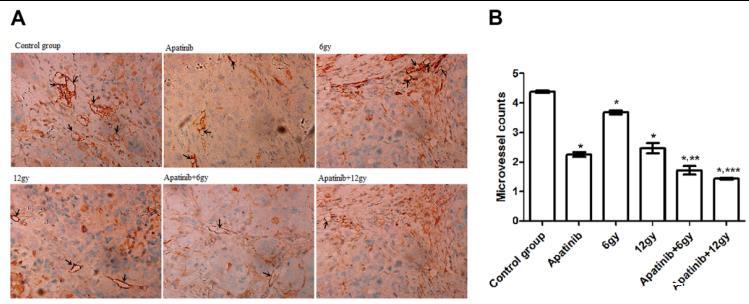 圖5 CNE-2鼻咽癌(NPC)腫瘤組織中CD31的表達。A、使用CD31抗體對接受不同治療方案的異種移植小鼠進行免疫組化染色,顯示微血管密度的差異。B、顯示各組血管數量的直方圖。*P<0.05與對照組相比。**P<0.05與阿帕替尼組(6 Gy)相比。與阿帕替尼組(12 Gy)相比,***P<0.05。