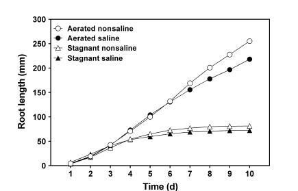 在通氣非鹽溶液中,每日根伸長率為28±2 mm(圖1)。通氣溶液中的鹽度使根生長速率降低了15%(P<0.05)。停滯非鹽和停滯含鹽處理中的根最初生長速率與兩種通氣處理中的根相似(前3天),但隨后生長減慢,到第10天幾乎停止。因此,10天后這些根的長度(mm)分別為:通氣非鹽中為250±3,通氣含鹽中為220±5,停滯非鹽中為81±1,停滯含鹽中為72±2。