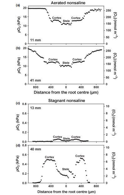 在停滯溶液中的根中,徑向pO?剖面顯示,與通氣處理中的根相比,這些根內(nèi)的皮層和中柱pO?顯著降低。對于停滯非鹽溶液中的根,在根尖區(qū)域徑向pO?剖面大致平坦,皮層和中柱的pO?分別約為0.07±0.02 kPa和0.02±0.003 kPa(圖3c)。停滯含鹽溶液中根的相應(yīng)pO?在皮層和中柱均低于檢測限(<0.02 kPa)。當(dāng)在近根尖區(qū)域測量徑向剖面時,pO?高于根尖附近,并且在根的任意半徑處都更高。停滯處理中根在近根尖區(qū)域的徑向剖面特點是:在停滯非鹽(圖3d)和停滯含鹽處理中,pO?在外層根細(xì)胞層(表皮和亞表皮)中從脫氧溶液中的約0 kPa輕微上升到這些根外層組織中的平均0.5和0.4pm 0.2 kPa。pO?在皮層中相當(dāng)恒定,但在穿過內(nèi)皮層/周皮層時急劇下降至非常低的壓力,在停滯非鹽(圖3d)和停滯含鹽處理中,根中柱內(nèi)的壓力分別為0.2和0.045±0.045 kPa。