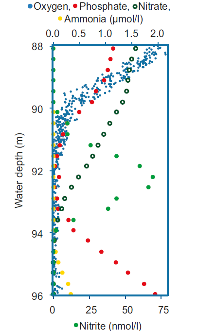 圖1、黑海亞氧化區的剖面圖。圖中顯示了黑海亞氧化區的化學物質濃度剖面。該區域位于90-106米水深之間,特點是既檢測不到氧氣(藍色圓點)也檢測不到硫化物(綠褐色圓點)。圖中顯示了溶解磷酸鹽在亞氧化區上邊界出現明顯最小值,在下邊界出現最大值。