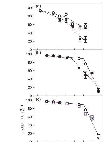 將第2季的CD與花期開始的熱時間作圖(圖3e),結果表明,與A+I葡萄藤相比,A+NI葡萄藤的活體組織開始快速衰退的時間更早,快速階段(斜率2)也更小(表2)。升溫增加了CD快速階段開始的熱時間,并且與灌溉有顯著的交互作用(表2)。缺水減緩了未升溫葡萄植株活體組織的快速衰退(斜率2),且與溫度有顯著的交互作用(表2)。在快速階段開始之前,處理或交互作用對CD緩慢階段的斜率沒有影響(表2)。