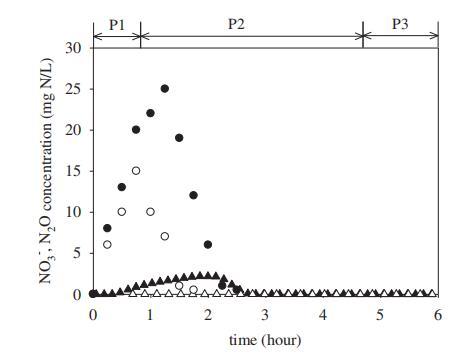 圖5顯示了母SBR在pH 6.0和pH 7.2下一個典型周期內的NO??和N?O曲線。兩種pH條件下進料期間硝酸鹽均積累。在pH 7.2時未檢測到N2O積累。在pH 6.0時,一旦進料期開始即出現N2O積累,這與批式測試2在pH 6.0下的結果一致。然而,積累的N?O可在缺氧階段后期、硝酸鹽完全去除后被消耗。