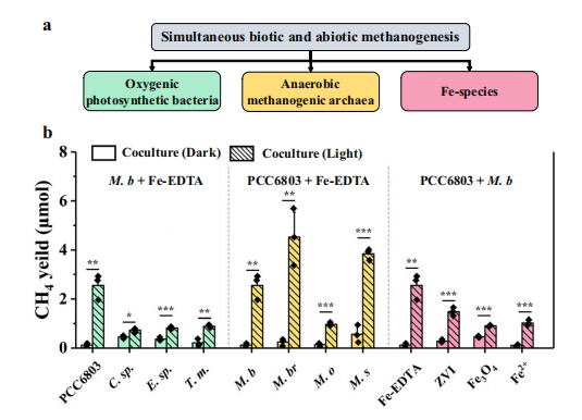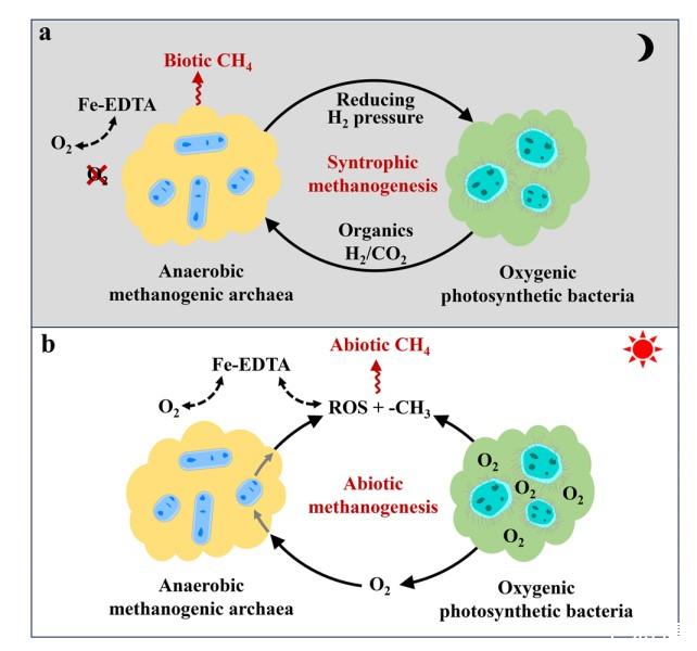 圖1、氧合光合細菌存在下的甲烷產生示意圖。a)無氧條件下黑暗中的合成共生甲烷生成。b)光照條件下氧氣存在下的非生物甲烷生成。