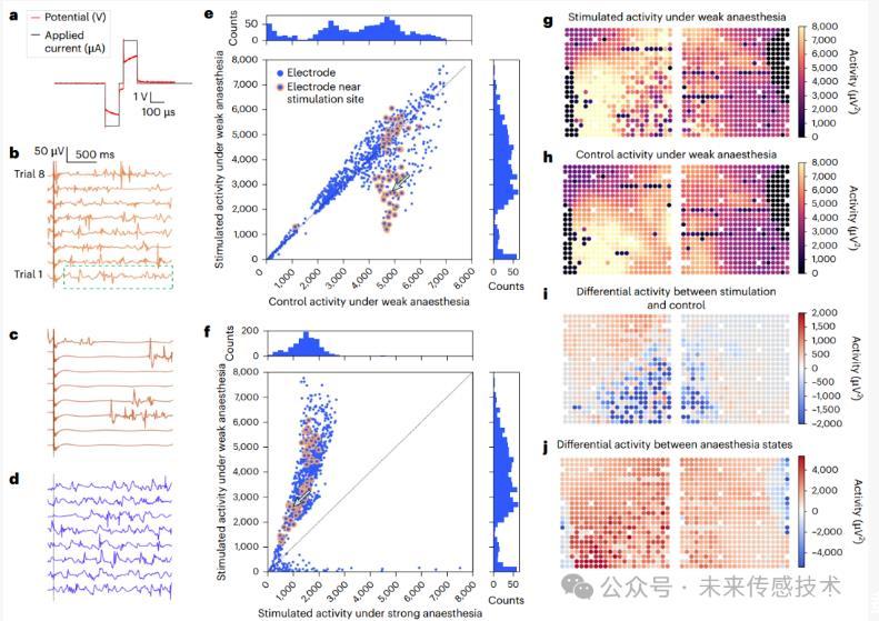 技術安全性經多維度驗證。42天慢性植入實驗顯示,薄膜電極組與傳統電極組的組織反應無顯著差異。運動皮層陣列移除后,軟膜再生完整度達100%。刺激安全性測試表明,100μA電流波形可誘發局部神經調制而不產生極化電位,這種精準調控能力在麻醉深度調節等應用中具有重要價值。