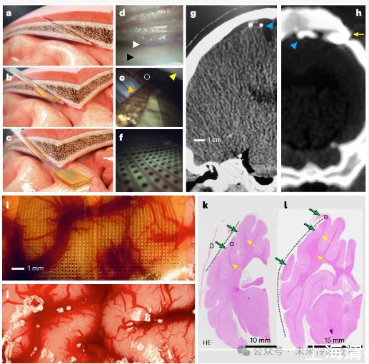微創植入技術的實現依賴精密的機械設計。研究團隊開發了獨特的顱微切口插入系統,通過聚酰亞胺口袋固定導針,使電極陣列在硬膜下空間展開時保持與皮層表面平行。CT影像顯示,植入后陣列邊緣與顱骨切口的間距可精確控制在50μm內。這種設計在豬模型實驗中展現出優異的可逆性:移除陣列后皮層表面完整性達到100%,組織學分析證實與傳統硬膜下電極無系統性差異。