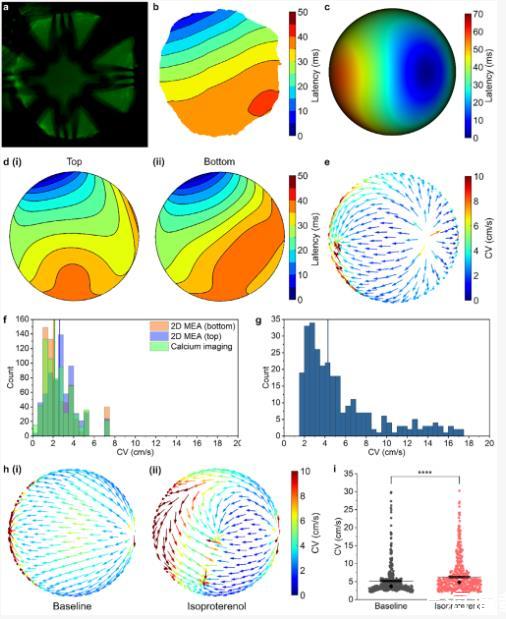 傳導速度(CV)分析進一步凸顯技術優勢。三維電生理映射測得CV為5.12 cm/s,而鈣成像因時空分辨率限制顯示較低值。異丙腎上腺素處理后,CV升至6.28 cm/s,且傳播模式呈現區域異質性——提示類器官內細胞類型分布不均。這種空間分辨能力是傳統二維技術無法實現的。