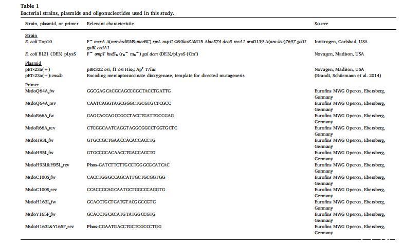 對(duì)于巰基琥珀酸雙加氧酶的定向誘變,使用先前研究中生成的表達(dá)載體pET23a(+)::msdoB4作為PCR模板DNA。每種情況下,通過點(diǎn)突變將一個(gè)編碼特定氨基酸的靶DNA三聯(lián)體替換為替代三聯(lián)體,例如位置93的組氨酸被亮氨酸取代產(chǎn)生MsdoH93L。生成以下酶變體:MsdoQ64A、MsdoR66A、MsdoH93L、MsdoH95L、MsdoC100S、MsdoH163L和MsdoY165F。使用Phusion DNA聚合酶和補(bǔ)充有1%(v/v)DMSO的Phusion High Fidelity緩沖液進(jìn)行PCR擴(kuò)增。對(duì)于msdo的定點(diǎn)誘變以生成變體MsdoH93L、MsdoH95L、MsdoH163L和MsdoY165F,使用一個(gè)磷酸化引物和一個(gè)非磷酸化引物進(jìn)行擴(kuò)增。在98°C初始變性2分鐘后,樣品進(jìn)行30個(gè)循環(huán)的98°C變性20秒、60°C退火20秒和72°C延伸2.5分鐘,最后在72°C延伸5分鐘。對(duì)于其他變體的構(gòu)建,使用非磷酸化引物。對(duì)每個(gè)變體進(jìn)行梯度PCR(每個(gè)溫度一個(gè)反應(yīng)管)。為此,樣品在98°C初始變性30秒,然后進(jìn)行18個(gè)循環(huán)的98°C變性30秒、55-65°C退火1分鐘和72°C延伸5分鐘,最后在72°C延伸10分鐘。PCR后,將不同溫度的十個(gè)反應(yīng)管合并,樣品在37°C下用FastDigest DpnI處理15分鐘以去除甲基化模板DNA。所有獲得的PCR產(chǎn)物使用peqGOLD凝膠提取試劑盒按照制造商說明從瓊脂糖凝膠中純化。使用T4 DNA連接酶進(jìn)行連接。然后將獲得的質(zhì)粒用于轉(zhuǎn)化CaCl2-感受態(tài)大腸桿菌Top10細(xì)胞。通過質(zhì)粒DNA測(cè)序鑒定攜帶所需突變的正向克隆,測(cè)序由Seqlab進(jìn)行。然后用驗(yàn)證的質(zhì)粒轉(zhuǎn)化表達(dá)菌株大腸桿菌BL21(DE3)pLysS的CaCl2-感受態(tài)細(xì)胞。