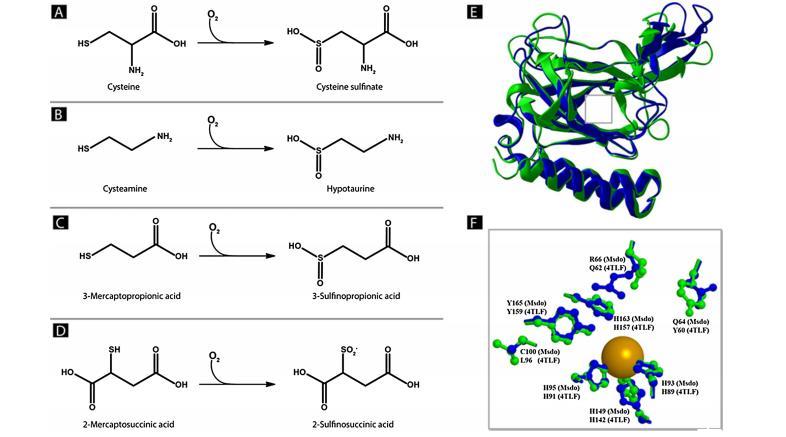 圖2顯示了硫醇雙加氧酶催化的反應(yīng)概述以及Msdo預(yù)測(cè)結(jié)構(gòu)與P.aeruginosa Mdo公開晶體結(jié)構(gòu)的結(jié)構(gòu)比對(duì)。