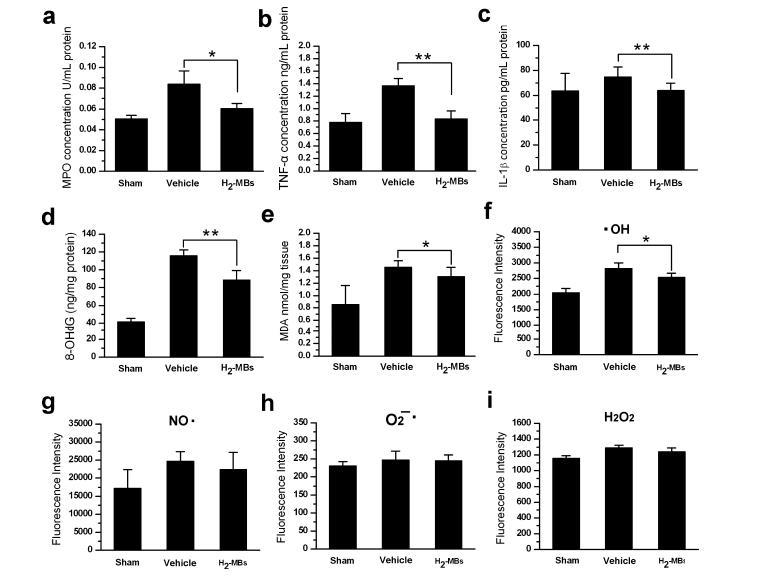 圖6.心肌促炎和促氧化細胞因子以及ROS的ELISA分析。從接受假手術處理、車輛處理或H2-MB處理的大鼠獲得心臟組織勻漿,這些大鼠經(jīng)歷了30分鐘的缺血和24小時的再灌注,以分析產(chǎn)生的心肌促炎和促氧化細胞因子。為了檢測ROS,在經(jīng)歷30分鐘缺血后,大鼠在再灌注40分鐘前靜脈注射了載體或H2-MBs。所有檢測的心肌促炎和促氧化細胞因子的水平在心肌缺血再灌注后均增加,但在大鼠接受H2-MBs后,這些水平以不同程度降低。(a?c)然后檢測了包括MPO、TNF-α和IL-1β在內的促炎細胞因子水平(n=6)。*P<0.05,**P<0.01。數(shù)據(jù)表示平均值±s.d。(d,e)檢測了促氧化劑8-OHdG和MDA細胞因子的水平(n=6)。*P<0.05,**P<0.01。數(shù)據(jù)表示平均值±s.d。(f?i)通過測量它們與HPF、DAF-2、NBT或CM-H2DCFDA的反應性來檢測勻漿中自由基(?OH、NO?、O2??)和H2O2的水平。使用自動微板讀數(shù)器測定熒光強度,具體描述見方法部分(n=3)。*P<0.05,**P<0.01。數(shù)據(jù)表示平均值±s.d.