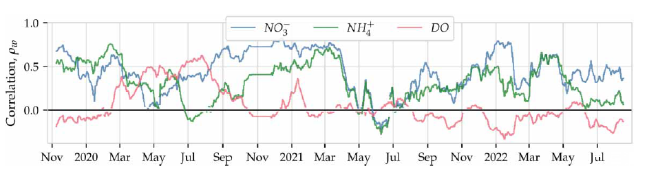 圖5、Fredericia滑動(dòng)窗口秩相關(guān)性。來自Fredericia的數(shù)據(jù)表明,N2O、NH4和DO之間的相似性在整個(gè)數(shù)據(jù)集中各不相同。N2O和NO3之間的相似性顯示出與N2O和NH4的相似行為。