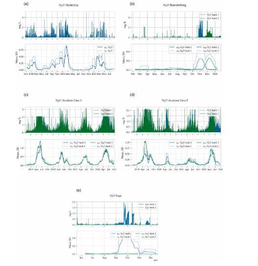 圖4、時(shí)間序列圖,用于比較a)弗雷德里西亞、(b)斯坎德堡污水處理廠、(c)阿韋德勒生物處理線、(d)阿韋德爾生物處理線3和(e)科格的N2O移動(dòng)平均值和移動(dòng)標(biāo)準(zhǔn)差。圖(a)所示的Fredericia案例,工藝特征每年都不同,并且有一種模式表明,N2O產(chǎn)量在冬季和春季在1-4月左右最高。斯坎德堡污水處理廠的N2O產(chǎn)量在11月和12月達(dá)到頂峰,而弗雷德里西亞的情況則不同。在圖(c)和(d)中,給出了Aved?re生物處理線1和3的N2O測量值。與弗雷德里西亞的數(shù)據(jù)類似,N2O具有多年來重復(fù)的季節(jié)性模式。Aved?re的N2O測量值在春末和夏季最高,在4月至6月左右達(dá)到峰值。K?ge污水處理廠的N2O剖面如圖(e)所示。K?ge污水處理廠的濃度在9月至10月左右達(dá)到頂峰,