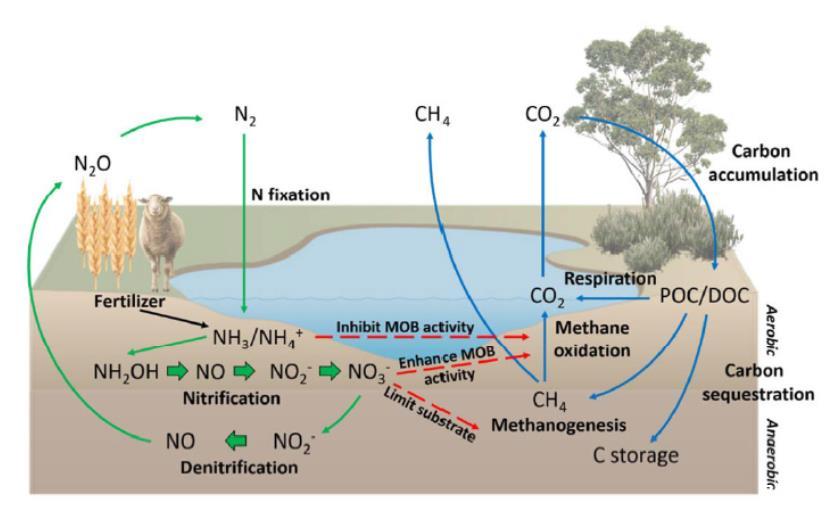 圖1、濕地的碳氮循環。綠色箭頭表示N-循環進程,藍色箭頭表示c-循環進程。增加水位促進了電子受體的可用性(即NO3