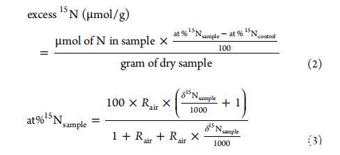 重復測量之間的分析誤差通常在±0.1‰以內。其中at%15Ncontrol代表第0天的值,δ15N表示為相對于大氣氮比率Rair=0.0036765的過量值。