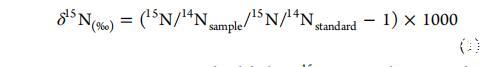 分別將沉積物和植物均質化、干燥,并使用與Flash EA1112元素分析儀聯用的Delta Plus Advantage質譜儀(Finnigan MAT)分析穩定氮同位素比率(15N/14N)。15N豐度使用相對于大氣氮標準的常規delta符號表示: