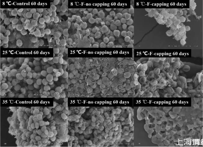 第0天收集的藻細胞顯示出完整的形態,對照組、F-no capping和F-capping組之間沒有明顯差異。實驗結束時,從三個系統中收集的大多數藻細胞在8°C下總體上顯示出完整的形態。然而,與對照組相比,在25°C下培養的F-capping組收集的藻細胞明顯變形和裂解。此外,在35°C下培養的F-capping組中觀察到比對照組和F-no capping組更多的裂解細胞。