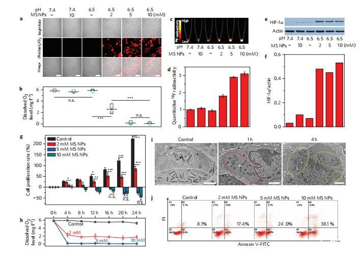 在本研究中,MS NPs或酸度單獨誘導的細胞生長沒有可檢測到的影響。然而,它們協(xié)同誘導的細胞內(nèi)缺氧卻能有效抑制細胞增殖。在施用較高濃度MS NPs的情況下,這種缺氧會導致細胞生長受到嚴重抑制,與對照組的指數(shù)生長曲線形成鮮明對比(圖4g)。在使用低濃度(2mM)MS NPs的情況下,培養(yǎng)基缺氧(圖4h)引起的細胞缺氧程度相對較低(圖4d),但在24小時內(nèi)細胞增殖抑制率仍高達50%左右。增加5毫摩爾的劑量可有效改善抑制效果,但進一步增加10毫摩爾的劑量后,耗氧率、細胞內(nèi)缺氧水平和細胞生長抑制效率都沒有明顯提高(圖4b、d、g),這表明在5毫摩爾左右就達到了缺氧飽和。在脫氧環(huán)境中保存時,這些缺氧細胞的形態(tài)發(fā)生了巨大變化,其特征是連續(xù)的細胞剝離、膜損傷和膜溶解)。此外,與常氧細胞不同的是,脫氧細胞中的線粒體受到了不可逆的破壞,表現(xiàn)為嚴重腫脹、膜破裂和漿溢出(圖4i)。據(jù)信,這些窒息的線粒體失去了呼吸和代謝ATP生成功能,最終導致細胞壞死和/或凋亡。