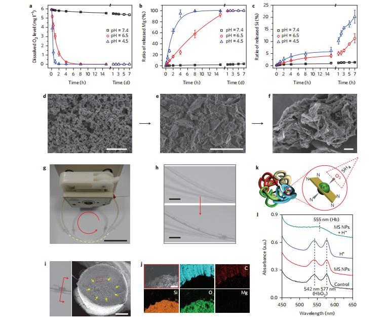鎂和硅釋放行為的定量比較進一步證實了硅的相對不穩(wěn)定性,在所有情況下,15小時內(nèi)的釋放量都小于5%,可以忽略不計,這與鎂在酸性介質(zhì)中的快速釋放形成了鮮明對比(圖3b,c)。與在pH=7.4條件下的惰性不同,MS NPs在酸性介質(zhì)中逐步演化和生長為清晰的納米片形態(tài),并最終轉化為較大的SiO2微片(圖3d-f)。至于硅烷燃燒的機理,釋放出的SiH4與溶解的O2反應首先會產(chǎn)生一系列瞬時中間產(chǎn)物,一般通式為HxSi(OH)4-x,其后的縮合物在很大程度上決定了SiO2片的尺寸(圖1)。與氣態(tài)O2相比,這種縮合相對緩慢,因為水溶液中的SiH4會逐漸釋放,這就為最終產(chǎn)物SiO2微片的形成提供了足夠的時間。這種在原位形成的二氧化硅聚集體可進一步演變成許多緊密的栓子,從而有效地阻塞模擬血液循環(huán)系統(tǒng)中的特氟龍毛細血管(圖3g-j),這表明在體內(nèi)這些形成的血栓很可能會阻塞直徑達幾十微米的腫瘤毛細血管。